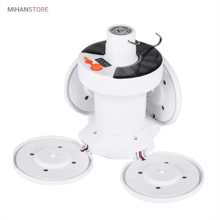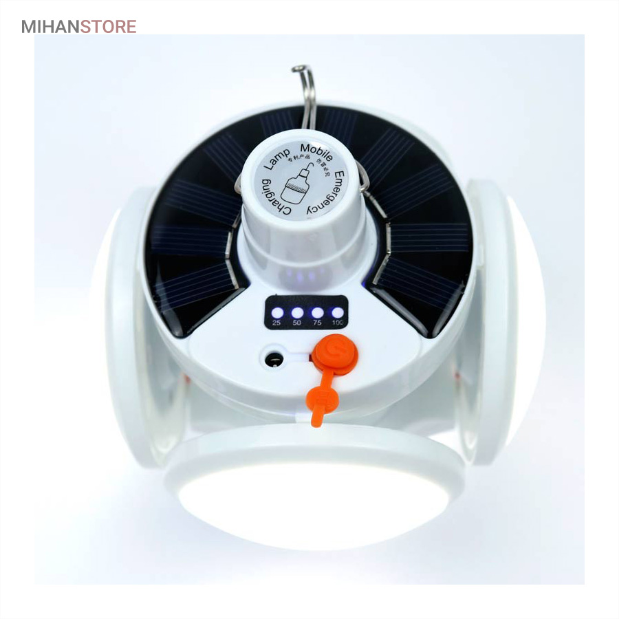از ویژگی های دیگر این لامپ داشتن صفحه سولار می باشد و این خود می تواند بهترین کمک را در ذخیره انرژی داشته باشد، همچنین دارای میزان روشنایی 800 لومن و چراغ نشانگر شارژ در قسمت بالای لامپ نیز می باشد. منبع تغذیه لامپ توسط پنل خورشیدی و همچنین آداپتور می باشد. برای شارژ کامل لامپ، 5 ساعت زمان لازم است و با هر بار شارژ کامل، می توانید به مدت 6 تا 8 ساعت از نور آن استفاده کنید. باز شدن چهار ال ای دی این چراغ سولار زیبایی آن را دوچندان کرده است.سایز لامپ در حالت بسته (مدل توپ) 16x14x16 سانتیمتر میباشد در حالت سقفی باز 30x16x30 سانتیمتر می باشد.